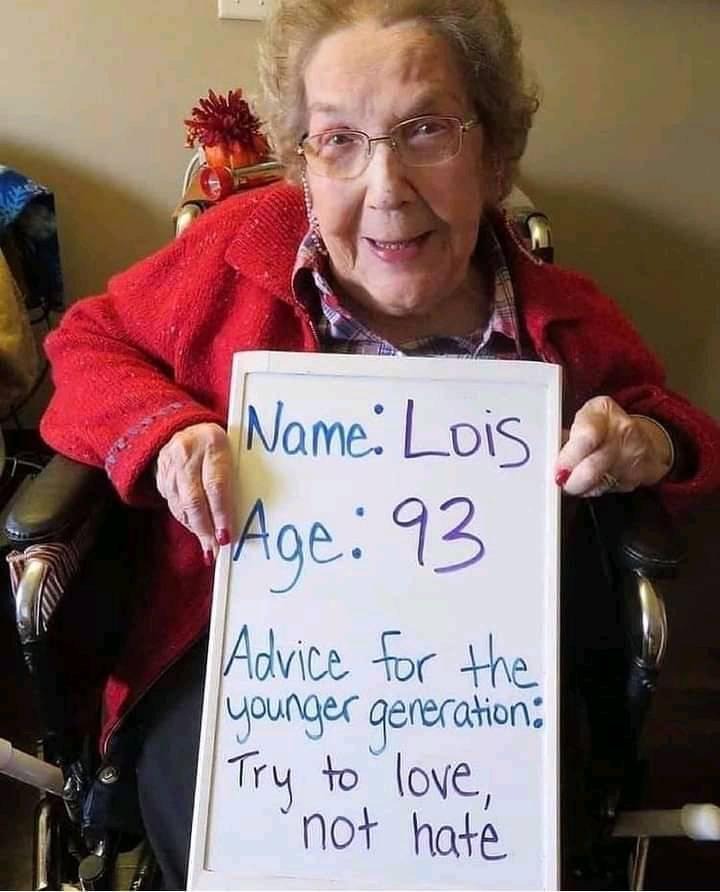 تیرانوے سال کی لوئس کہتی ہیں “پیار کرنے کی کوشش کریں ناکہ نفرت“۔ بے شک کسی سے نفرت کرکے وقت برباد اور دل جلانے سے بہتر ہے ایسے لوگوں سے پیار میں وقت گزارا جائے جو آپ کی پرواہ کرتے ہیں۔