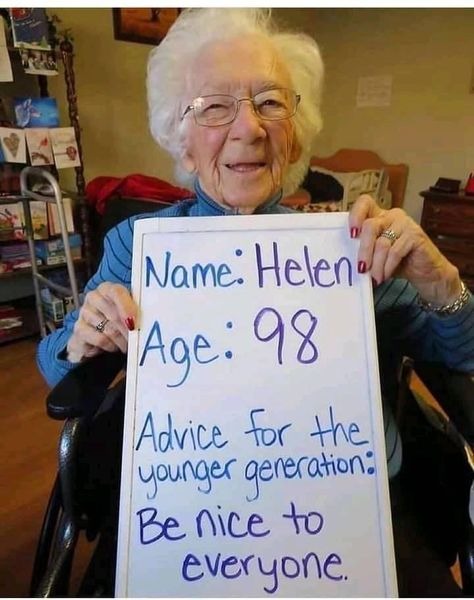 اٹھانوے سال کی ہیلن کا نوجوان نسل کو مشورہ ہے کہ “ہر ایک سے اچھا سلوک کرو“ ایسا کرنا اس لئے ضروری ہے کیونکہ ہمیں پتا نہیں ہوتا اگلا کس تکلیف سے گزر رہا ہے اس لئے اخلاقی تقاضہ یہ ہے کہ اچھا سلوک کیا جائے۔