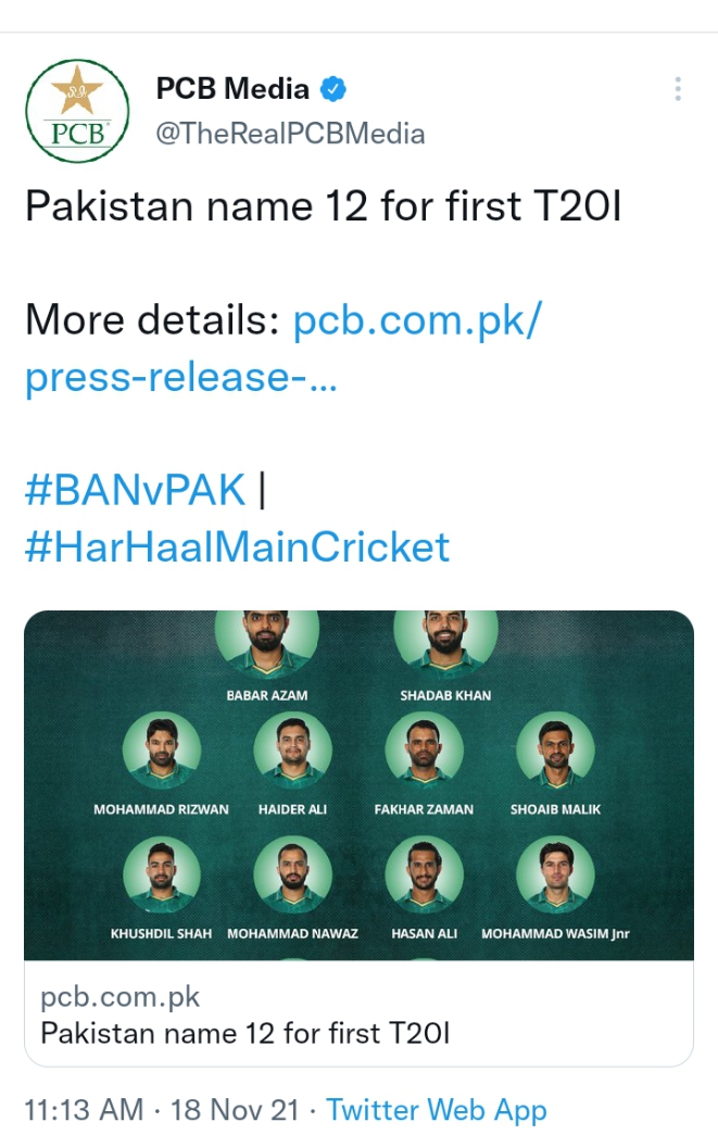 پاکستانی ٹیم بنگلہ دیش میں ٹی ٹوئنٹی سیریز کے میچز کھیلنے گئی ہے۔ پاکستان اور بنگلہ دیش کے درمیان تین میچز ہوں گے جس میں سے پہلا میچ کل شیر بنگلہ کرکٹ اسٹیڈیم میں کھیلا جائے گا۔ پاکستانی ٹیم کے کھلاڑیوں میں حیدر علی ، محمد نواز اور محمد وسیم، کپتان بابر اعظم ، وکٹ کیپر محمد رضوان ، شاہین شاہ آفریدی ، خوشدل شاہ ، فخر زمان ، حارث رؤف شعیب ملک اور حسن علی شامل ہیں ۔