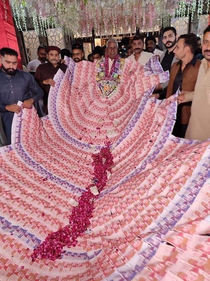 اس تصویر کو دیکھ کر ایسا لگتا ہے دولہا نے شادی پر ملنے والی تمام سلامی کو سو پچاس کے نوٹوں میں تقسیم کرکے اتنا بڑا ہار بنوایا ہوگا۔ کیا آپ بھی اپنی شادی میں ایسا ہار پہننا پسند کریں گے؟