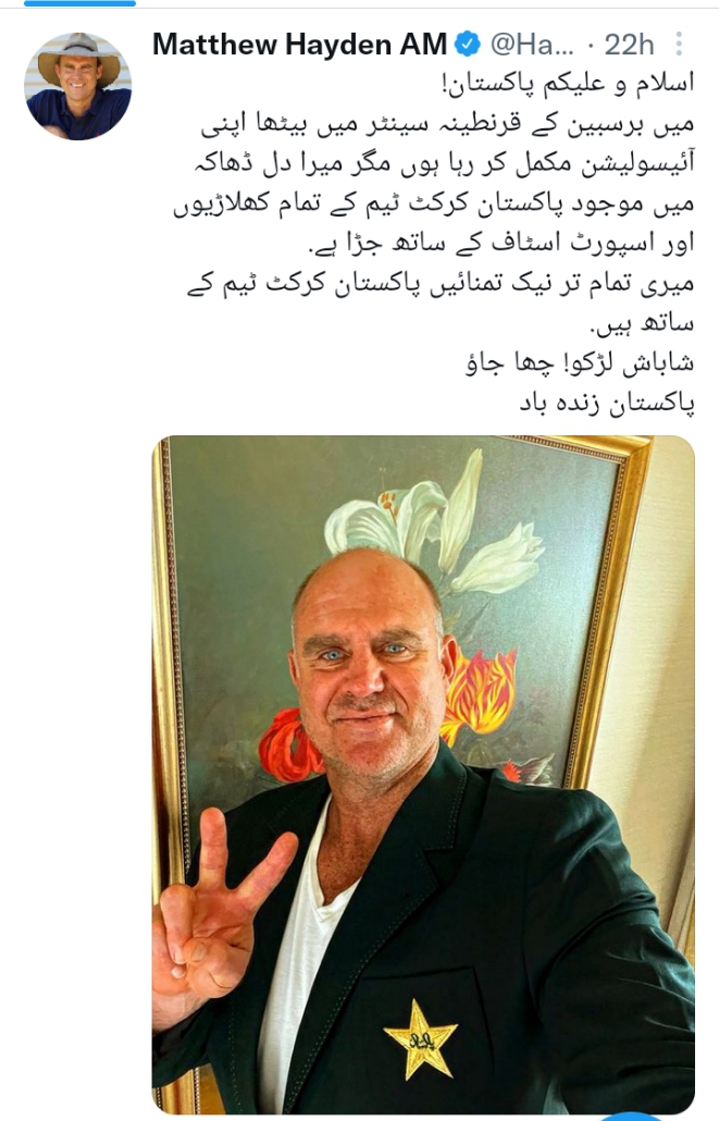 پاکستان کی ہمت بندھانے کے لئے سابق آسٹریلیوی اوپنر اور سابق بیٹنگ کنسلٹنٹ میتھیو ہیڈن نے ٹیم کے لئے ایک دل چھو دینے والا پیغام بھی بھیجا جس میں وہ اردو میں لکھتے ہیں کہ “اسلام و علیکم پاکستان۔ میں اس وقت برسبین میں قرنطینہ میں وقت گزاررہا ہوں لیکن میرا دل پاکستانی ٹیم کے ساتھ دھڑک رہا ہے۔ میں پاکستانی ٹیم کی جیت کا خواہشمند ہوں اور مجھے پوری امید ہے کہ ٹیم گرین ضرور جیت کر دکھائے گی“ آخر میں میتھیو نے “پاکستان زندہ باد“ کا نعرہ بھی لگایا۔