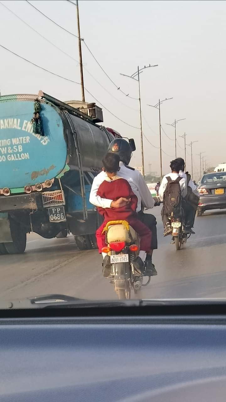 سوشل میڈیا پر وائرل ہونے والی یہ تصویر غور سے دیکھیں تو آپ کو اندازہ ہوگا کہ باپ موٹرسائیکل چلا رہا ہے اور بچہ گاڑی پر بیٹھے ہوئے نیند سے اونگھ رہا ہے۔ کہیں بچہ گاری سے نیچے نہ گر جائے اس لئے باپ نے اپنے ایک ہاتھ سے بچے کو کمر سے تھام لیا اور دوسرے ہاتھ سے بائیک چلا رہا ہے۔