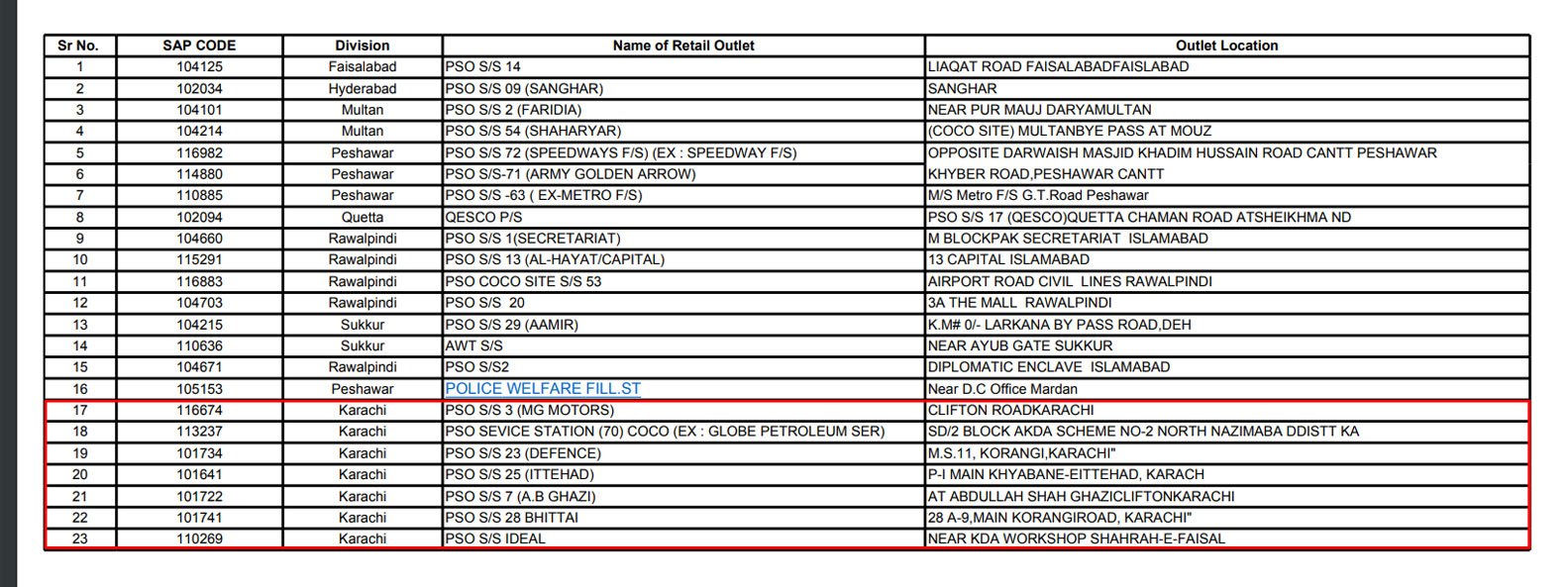 پی ایس او نے ایک فہرست جاری کی ہے جس میں مختلف شہروں میں ان کے براہ راست پیٹرول پمپس کے نام درج ہیں۔