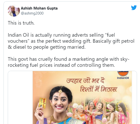 واضح رہے کہ شادی میں پیٹرول کا تحفہ انڈیا میں کسی شادی کے دوران ایک سماجی کارکن نے بھتیجی کو شادی میں پیش کیا تھا جس پر لوگوں نے خوب داد دی تھی۔