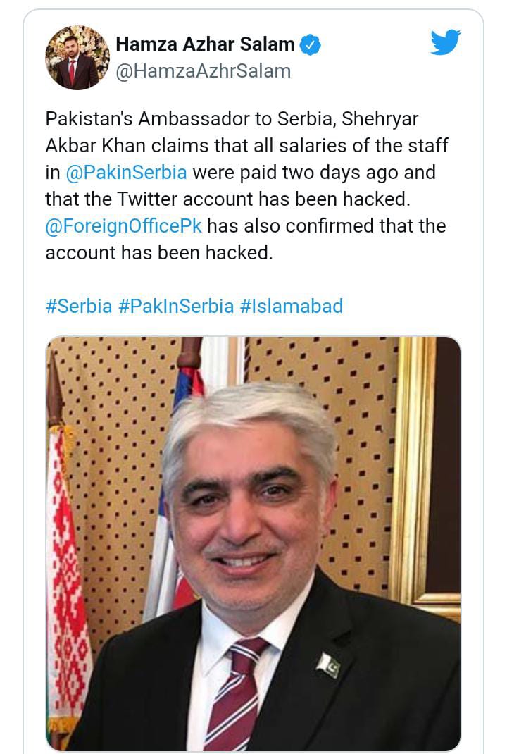 پاکستان کے سربیا کے سفیر شہریار اکبر خان نے میڈیا زرائع کو وضاحت دیتے ہوئے کہا کہ سفارت خانے کے تمام عملے کو تنخواہیں دی جاچکی ہیں اور جہاں تک اس ٹوئٹ کا سوال وہ اکاؤنٹ ہیک ہونے کا نتیجہ ہے۔