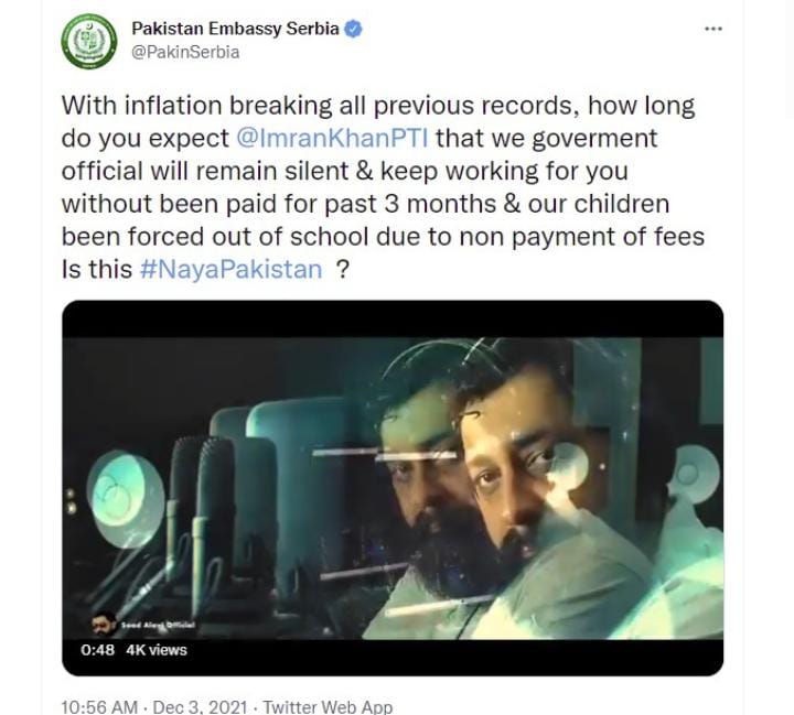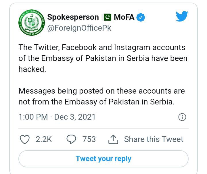 سربیا میں پاکستانی سفارت خانے کی سرکاری ویب سائٹ پر ایک ٹوئٹ کیا گیا جس میں ہیک کرنے والے نے لکھا کے “سفارت خانے کے عملے کو پچھلے تین ماہ سے تنخواہ نہیں ملی ہے اس وجہ سے وہ بچوں کے اسکول کی فیسیں بھی نہیں دے سکے ہیں۔ میں معزرت خواہ ہوں لیکن میرے پاس یہی ایک آپشن بچا تھا“۔ ساتھ ہی ہیکر نے عمران خان کو پکارتے ہوئے سوال کیا کہ کہ کیا یہی ہے نیا پاکستان؟