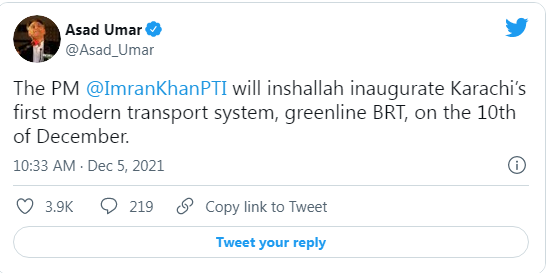 جب ہی وفاقی وزیر برائے منصوبہ بندی اسد عمر کی جانب سے ٹوئیٹ کیا گیا ہے کہ عمران خان 10 دسمبر کو گرین لائن بی آر ٹی کا افتتاح کریں گے۔