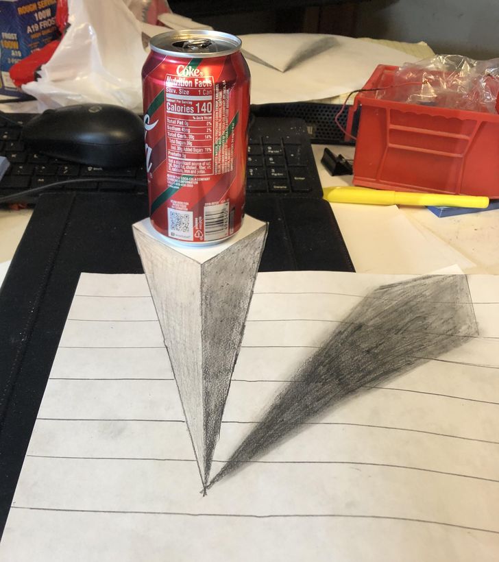 اسے کہتے ہیں ایک ماہرانہ آرٹسٹ کا فن۔ اوپر فوٹو میں 'ڈرنک کین' پینسل سے بنے تکون شیپ پر رکھا نظر آرہا ہے جو آنکھوں اور دماغ دونوں کو شدید اُلجھن میں مبتلا کر رہا ہے۔