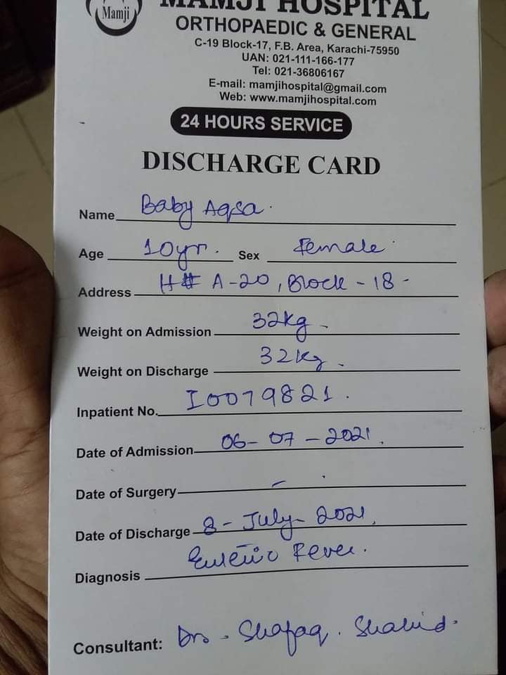 بُخار، کھانسی، ہاضمے کی خرابی اور قے ہونا ایک عام بات ہے۔ ان کا علاج بروقت کیا جائے تو بچہ ہو یا بڑا سب ہی صحتیاب ہو جاتے ہیں۔ لیکن اگر وقت پر صحیح علاج نہ کیا جائے تو جانی نقصان ہو جاتا ہے۔ 10 سالہ اقصیٰ جمال نامی بچی کو کراچی کے مشہور مامجی ہسپتال میں بخار، ہاضمے کی خرابی اور الٹیوں کی شکایت پر داخل کروایا۔