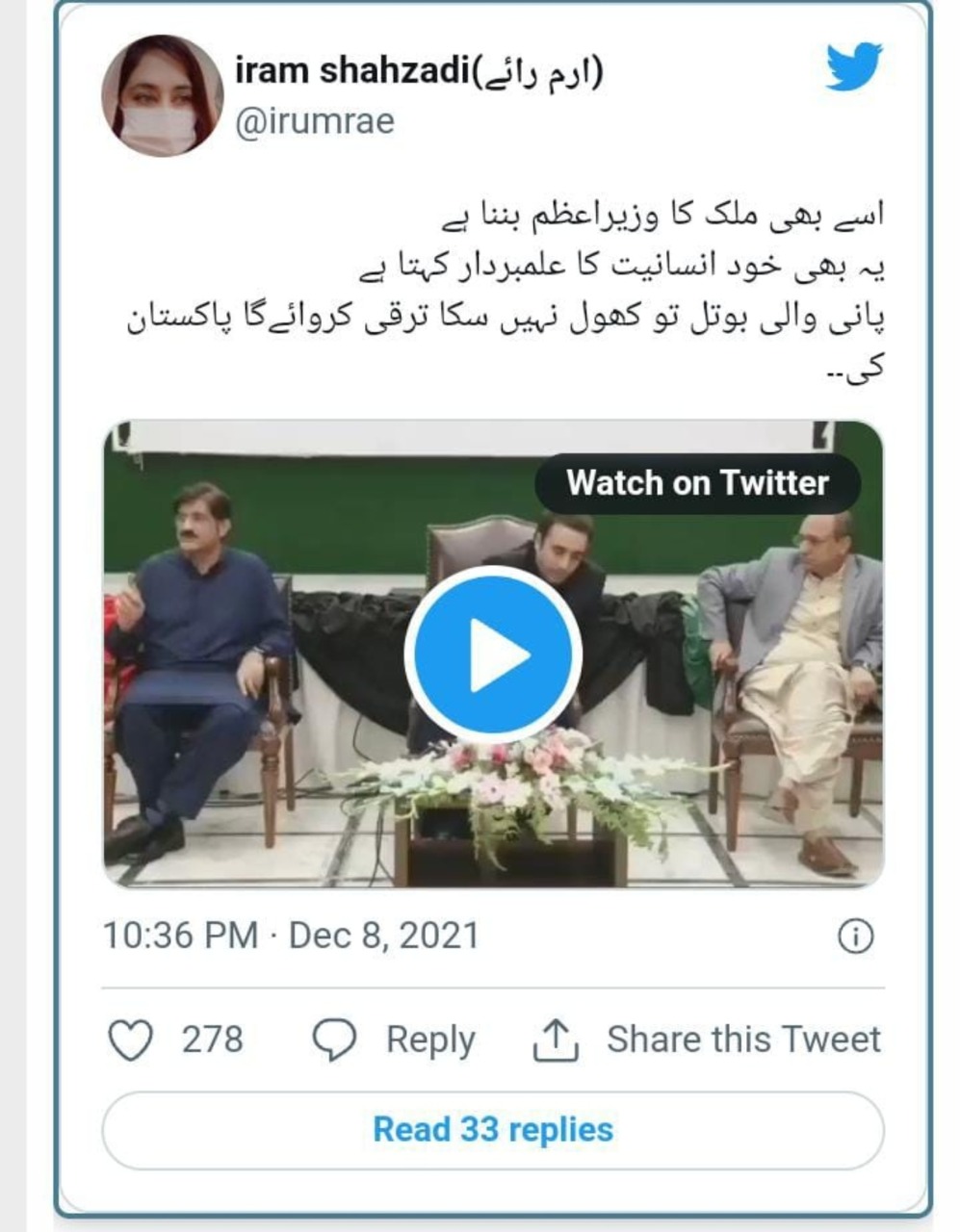 اس ویڈیو کے بعد سوشل میڈیا پر بلاول اور سعید غنی دونوں کو ہی تنقید کا سامنا کرنا پڑ رہا ہے۔ صارفین کا کہنا ہے کہ جو شخص بوتل کا ڈھکن نہیں کھول سکتا وہ وزیرِ اعظم بننے کا خواب دیکھا رہا ہے۔