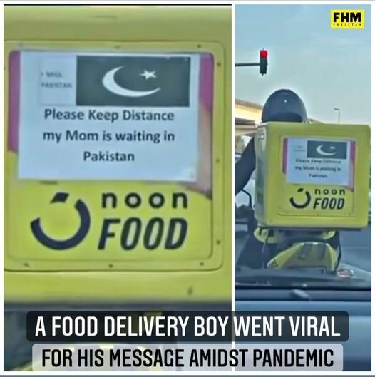 غالباً اسی جذبے کو مدنظر رکھتے ہوئے اس فوڈ ڈلیوری بوائے نے اپنی موٹر سائیکل کے پیچھے یہ الفاظ لکھوائے ہیں "فاصلہ رکھیں پاکستان میں میری ماں میرا انتظار کررہی ہیں"
