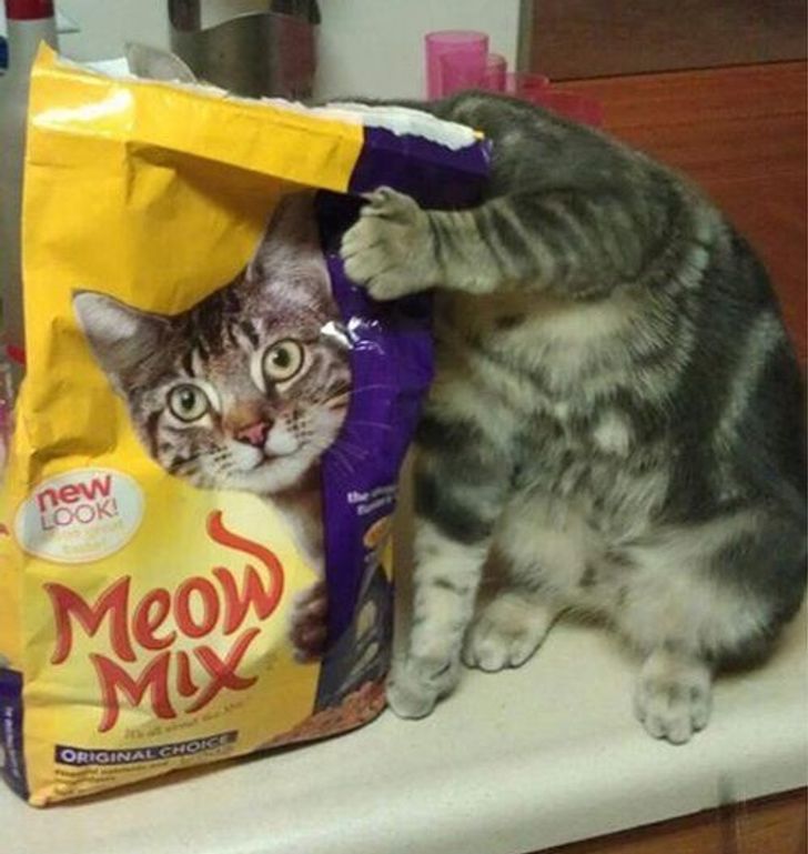 بلی تو چھپ گئی اپنے کھانے کے پیکٹ کے پیچھے اور جو چہرہ اس پیکٹ پر بنا ہوا ہے دیکھنے والوں کو اس تصویر نے حیرانی میں مبتلا کر دیا ہے۔