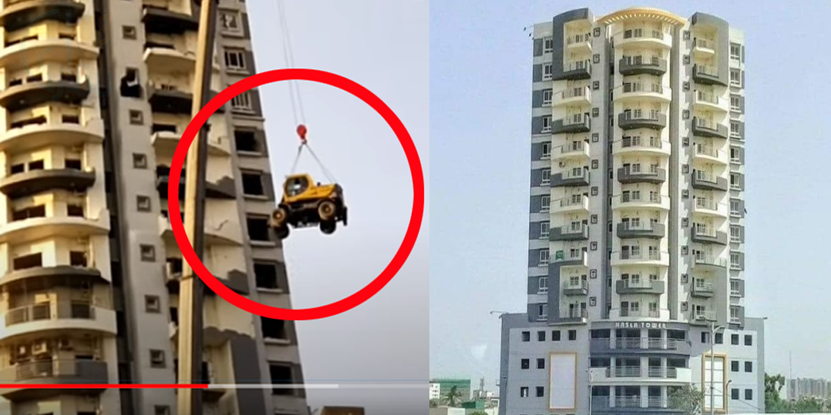 یوٹیوب چینل فوکس ود فہیم کی جانب سے اپلوڈ کی گئی ویڈیو میں نسلہ ٹاور کی سولویں منزل پر کرین کی مدد سے ایکسکیویٹر کو چڑھایا جا رہا ہے۔