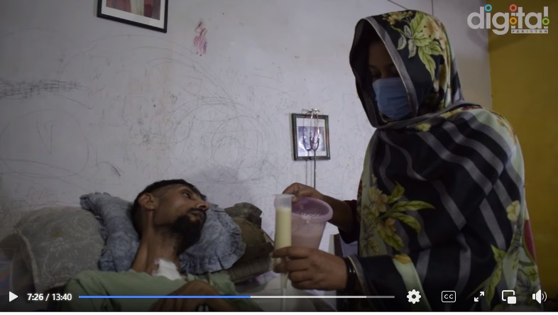 خاتون نے مذید بتایا کہ:'' میرے شوہر 3 ماہ تک انڈس ہسپتال کے آئی سی یو میں رہے اور پھر جب ان کی کچھ حالت بہتر ہوئی تو ڈاکٹروں نے مجھے کہا کہ اب آپ اس کو نیروسرجن اور فزیوتھراپی کے لیے لے کر جائیں۔ ہمارے ہاں نیروسرجن دستیاب نہیں ہیں۔ ہم میں نے ان کو نجی ہسپتال میں بھی داخل کروایا لیکن اس کا خرچہ پہنچ سے زیادہ تھا۔ میں نے ڈاکٹروں سے بات کی تو انہوں نے مجھے مشورہ دیا کہا ب آپ ان کو اپنے گھر لے جائیں اور وہاں ہسپتال والا بستر ہی لگائیں تاکہ مریض کو اٹھانے بیٹھانے میں آسانی ہو۔ میں نے بالکل ایسا ہی کیا۔ پہلےان کی صحت اچھی تھی، مجھے ان کو اٹھانے بیٹھانے میں بہت وقت لگتا تھا، میری چیخیں نکل آتی تھیں لیکن پھر میں اللہ کو یاد کرکے اپنے شوہر کو زبردستی اٹھا لیتی تھی۔ ان کو یورین بیگ تک لگا ہوا ہے اور کھانے پینے کے لیے نلکی لگی ہوئی ہے۔ اس نلکی سے صرف اور صرف دودھ اور دیگر لیکوئیڈز ہی اندر جاتے ہیں۔ ڈاکٹروں نے ان کو بکرے کی یخنی پلانے کا مشورہ دیا ہوا ہے۔ میں روزانہ ان کے لیے وہ یخنی بنا کر اسی نلکی کے ذریعے ان کے جسم میں داخل کرتی ہوں۔