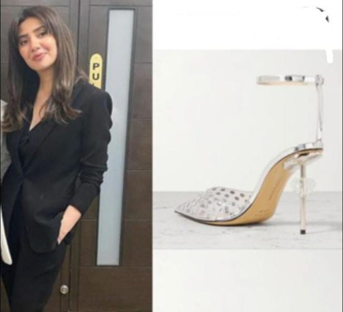 یہ سلور سینڈلز کافی خوبصورت اور سامنے سے تکونی شکل کے ہیں جن کے اوپری حصے میں جابجا نگینے جڑے ہیں۔ ماہرہ نے اس حسین سینڈل کو سیاہ رنگ کے ٹو پیس کے ساتھ پہنا جس نے ان کے انداز میں چار چاند لگا دئیے ہیں۔