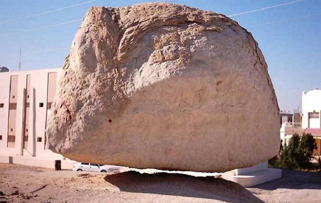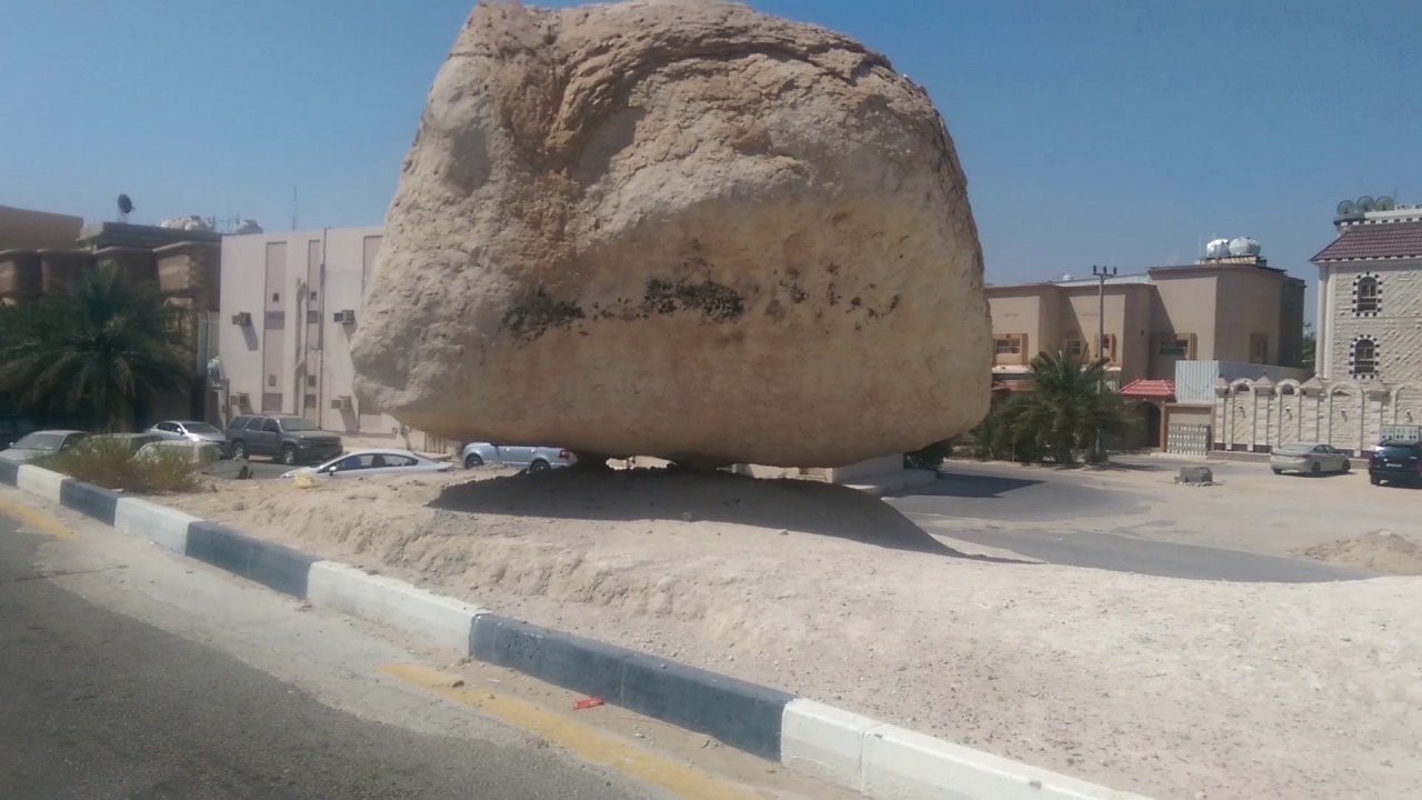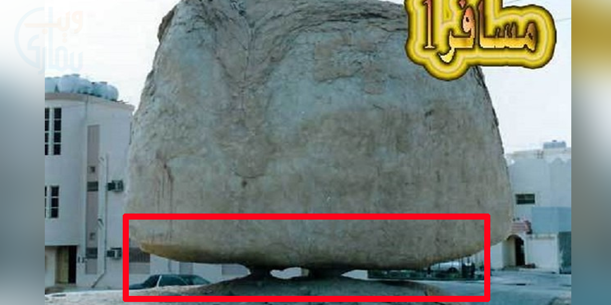 سعودی عرب کے ال احصاء کے علاقے میں واقع یہ پتھر کچھ اس طرح موجود ہے کہ نیچے سے سہارے کے لیے دو سے تین پتھریلے پلر نما پتھر موجود ہیں جو کہ اسے بیلنس رکھے ہوئے ہے۔ جعلی تصاویر میں انہی پلرز کو غائب کر دیا گیا ہے، جس کی وجہ سے یہ معلوم ہو رہا ہے جیسے کہ یہ کوئی کرشمہ ہو۔