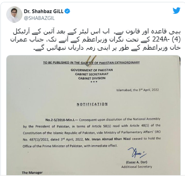 دوسری جانب پی ٹی آئی رہنما شہباز گل نے کابینہ کے نوٹیفیکشن کو شئیر کیا جس میں انہوں نے لکھا کہ یہی قاعدہ اور قانون ہے۔ اب اس لیٹر کے بعد آئین کے آرٹیکل 224A- (4) کے تحت نگران وزیراعظم کے آنے تک، جناب عمران خان وزیراعظم کے طور پر اپنی زمہ داریاں نبھائیں گے۔