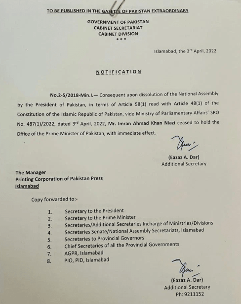 نوٹیفکیشن کے مطابق صدر کی جانب سے قومی اسمبلی تحلیل ہونے کے بعد عمران خان اب وزیراعظم کے منصب پر نہیں رہے۔
