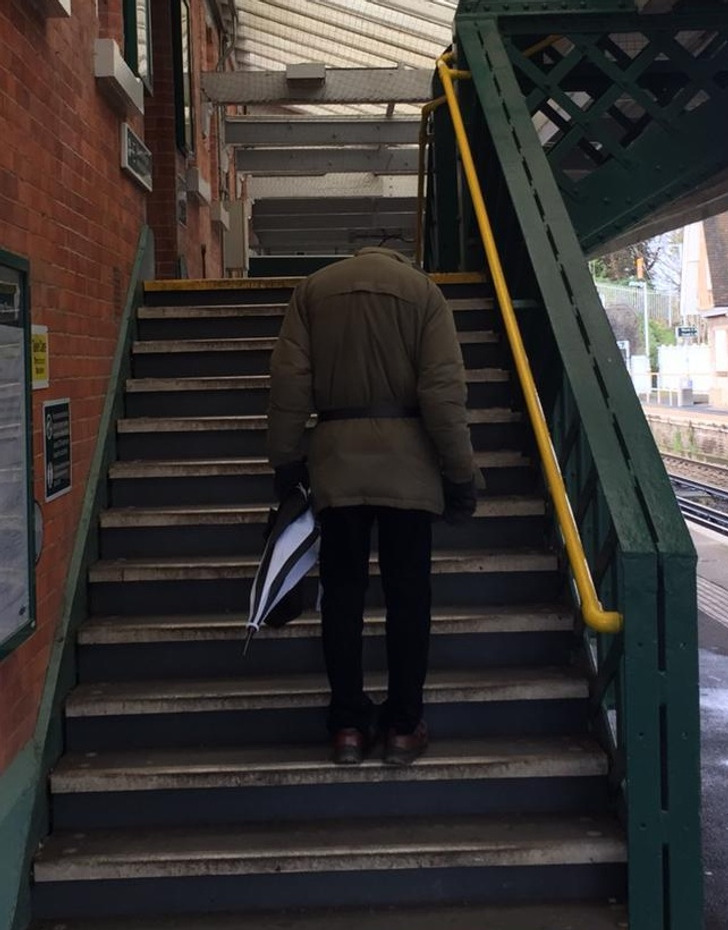 سیڑھیوں پر چڑھتا ایک شخص جس کا پورا جسم تو نظر آرہا ہے لیکن سر دھڑ سے غائب ہے۔ کیا آپ دیکھ کر بتا سکتے ہیں کہ بند چھتری ہاتھ میں لیے اس شخص کا سر کہاں گیا؟