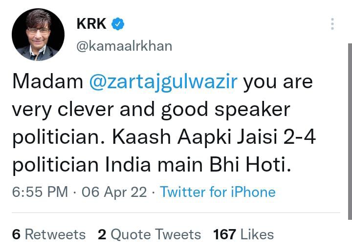 اتنا ہی نہیں کمال راشد خان اپنے ایک اور ٹوئٹ میں زرتاج گل کو ٹیگ کرکے لکھتے ہیں کہ “محترمہ آپ کافی ذہین اور بہترین مقرر ہیں۔ کاش آپ جیسی 3,4 سیاست دان انڈیا میں بھی ہوتیں“