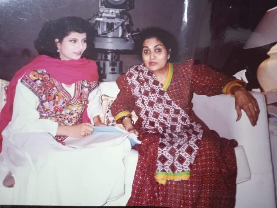 اس تصویر میں حسینہ معین تو واضح طور پر موجود ہیں، حسینہ آپا کی جوانی اور بڑھاپے کی جھلک کچھ یوں تھیں کہ کوئی بھی باآسانی پہچان جائے کہ ان میں بہت کم تبدیلی آئی ہے۔ مگر اس تصویر میں حسینہ معین کے ساتھ ایک اور شخصیت موجود ہیں۔