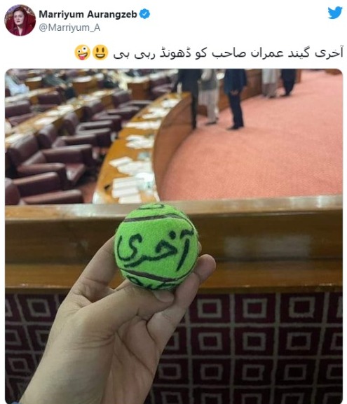 یہ بال مریم اورنگزیب اپنے ساتھ قومی اسمبلی لے کر آئی ہیں جس حوالے سے انہوں نے ٹوئٹر پر تصویر شئیر کی۔ لیگی رہنما مریم اورنگزیب نے آخری گیند کی تصویر جاری کی اور لکھا کہ ’آخری گیند عمران صاحب کو ڈھونڈ رہی ہے۔