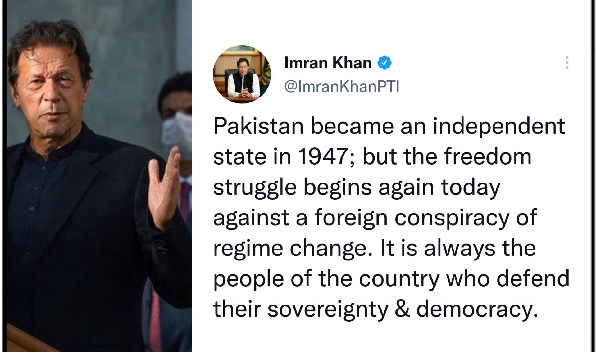 ٹوئٹر پر عمران خان نے لکھا کہ پاکستان 1947ء میں ایک آزاد ریاست بنا لیکن حکومت کی تبدیلی کی غیر ملکی سازش کے خلاف آج پھر سے آزادی کی جدوجہد شروع ہو رہی ہے۔ یہ ہمیشہ ملک کے عوام ہی ہوتے ہیں جو اپنی خودمختاری اور جمہوریت کا دفاع کرتے ہیں۔