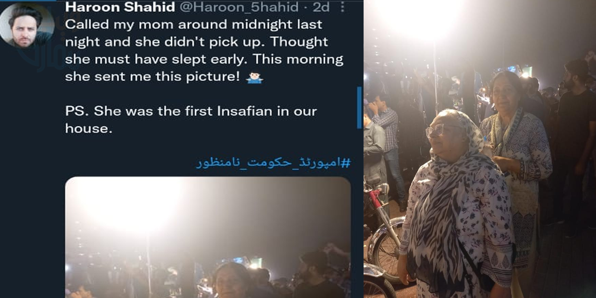 دوسری جانب گلوکار ہارون شاہد نے ٹوئیٹر پر والدہ کی تصویر شئیر کرتے ہوئے لکھا کہ امی کو کال کی تو انہوں نے کال نہیں اٹھائی، میں نے سوچا کہ شاید سو گئی ہوں گی۔ مگر صبح انہوں نے یہ تصویر شئیر کی۔ ساتھ ہی لکھا کہ وہ پی ٹی آئی کی سپورٹر بھی ہیں۔