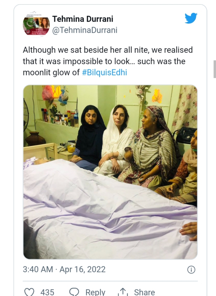 تہمینہ درانی، بلقیس ایدھی کی میت کے دیدار کے لیے ان کے اہل خانہ سے ملیں۔ میت کے ساتھ تصویر ٹوئٹ کرتے ہوئے تہمینہ نے لکھا کہ" اگرچہ ہم ساری رات ان کے ساتھ بیٹھے رہے لیکن بلقیس ایدھی کے چہرے کی جانب دیکھنا ممکن نہیں تھا ان کے چہرے پر چاند جیسا نور تھا جس کی وجہ سے نظر ان پر ٹہر نہیں رہی تھی"