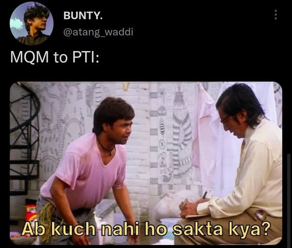 ایک اور تصویر میں بھارتی فلم کے ڈائیلاگ کا ہے، جس میں ایم کیو ایم اور پی ٹی آئی کا حوالہ دیا گیا ہے، اور کہا گیا ہے کہ کیا اب جب کچھ نہیں ہو سکتا کیا؟ دراصل ایم کیو ایم جلسے سے گھبرائی ہوئی ہے یہی بتایا گیا ہے۔