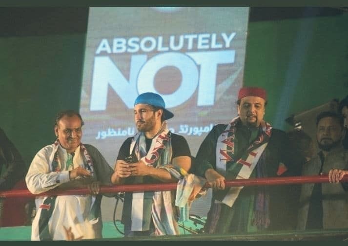ایک اور تصویر میں اداکار فیروز خان کو دیکھا جا سکتا ہے جو کہ کھڑے ہو کر عوام کے جذبے کو تک رہے ہیں۔ فیروز سوشل میڈیا پر عمران خان کو سپورٹ کرتے دکھائی دیتے ہیں۔ جبکہ اس جلسے میں بھی وہ خوب تیاری کر کے آئے ہیں۔