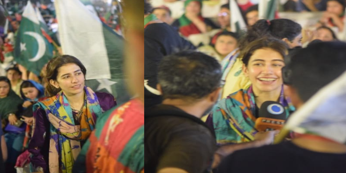 اس تصویر میں مشہور اداکارہ سائرہ یوسف کو دیکھا جا سکتا ہے جو کہ جلسے میں شرکت کے لیے نہ صرف آئیں بلکہ میڈیا کو اس حوالے سے آگاہی بھی فراہم کر رہی ہیں۔