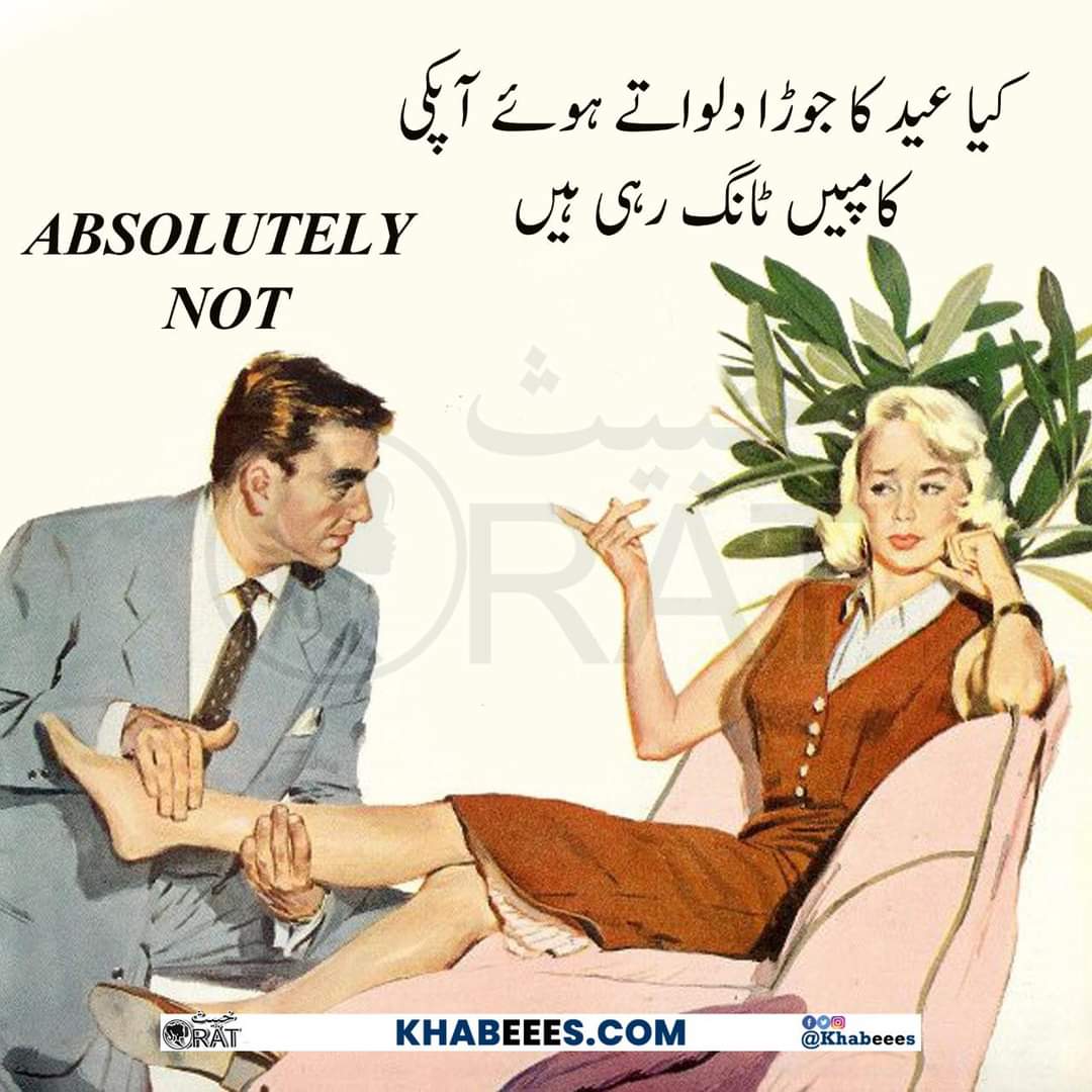 وہیں بیوی شاپنگ سے متعلق سوال کرتی ہے کہ کیا عید کا جوڑا دلواتے وقت آپ کی کانپیں ٹانگ رہی ہیں؟ جس پر شوہر نے جواب دیا Absolutely Not.