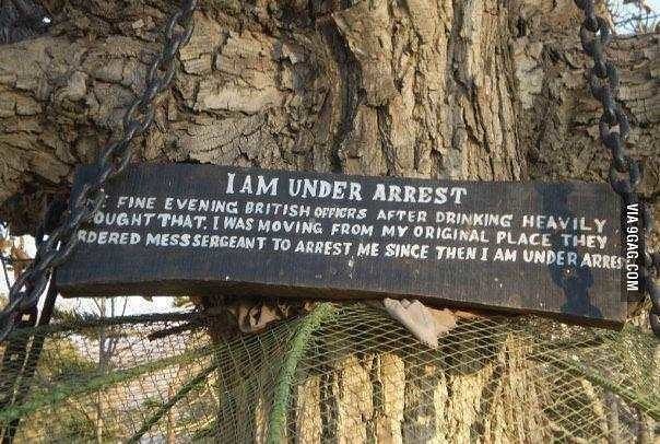 درخت پر ایک تختی بھی لگی ہے جو کہ اس پورے واقعے کو آپ بیتی کے طور پر بیان کر رہی ہے کہ میری کہانی میری زبانی۔ ’ایک شام نشے میں دھت ایک برطانوی فوجی افسر کو ایسا محسوس ہوا کہ میں اپنی جگہ سے ہل رہا ہوں اور اس نے میس سارجنٹ کو حکم دیا کہ مجھے گرفتار کر لیا جائے اور تب سے میں زیر حراست ہوں۔‘’