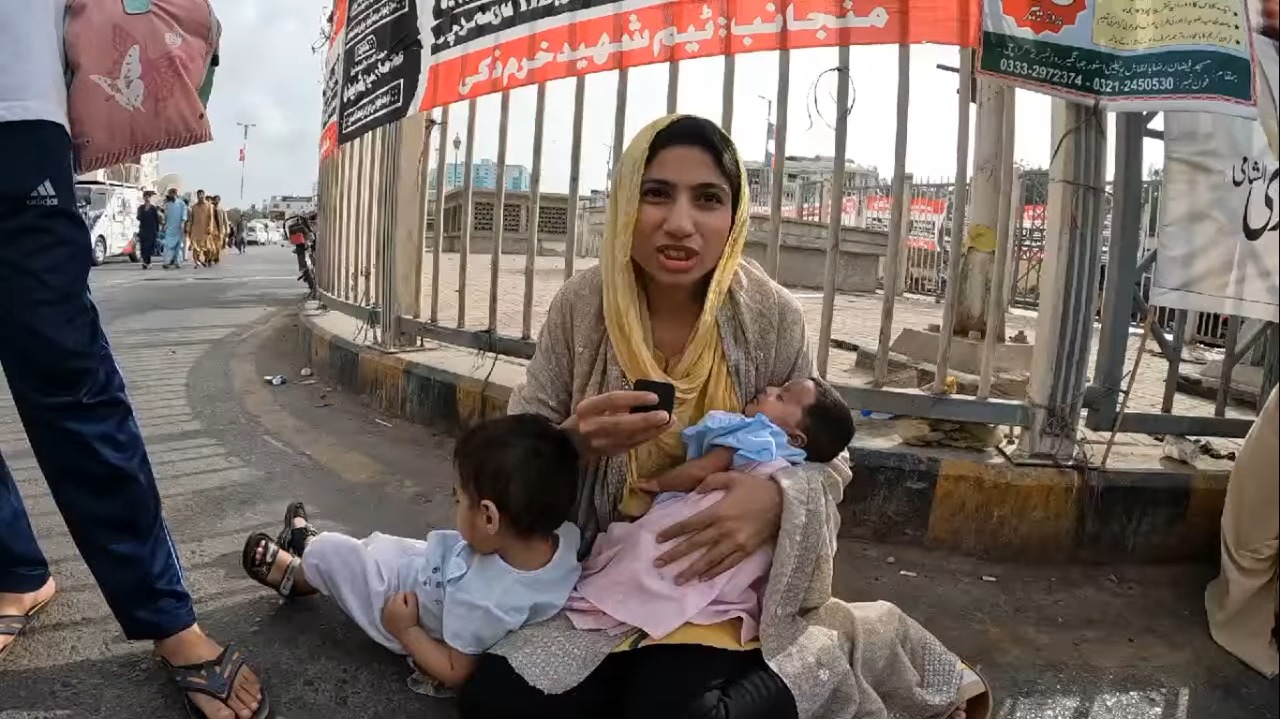انہی مظاہرین میں ایک خاتون بھی اپنی ایک ماہ کے بچی کے ساتھ نمائش چورنگی پہنچی ہوئی ہیں جن کی ویڈیو سوشل میڈیا پر وائرل ہو رہی ہے۔