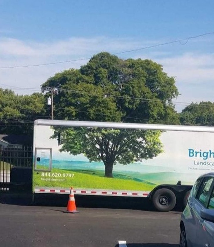 تصویر میں دکھائ دینے والا درخت کوئی پینٹنگ جیسا ہے لیکن حقیقت میں اصلی درخت کے آگے بالکل اس جیسی ہی تصویر والا ٹرک کھڑا ہے۔