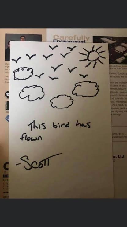 ہر آنے والے ملازم کو ایک نہ ایک دن تو چھوڑ کر جانا ہوتا ہے شاید اسی لئے اسکاٹ صاحب نے استعفے میں مختلف اڑتے ہوئے پرندے بنا دیے اور لکھا کہ یہ پرندہ بھی اڑ گیا۔ کیا خوب استعفیٰ ہے۔