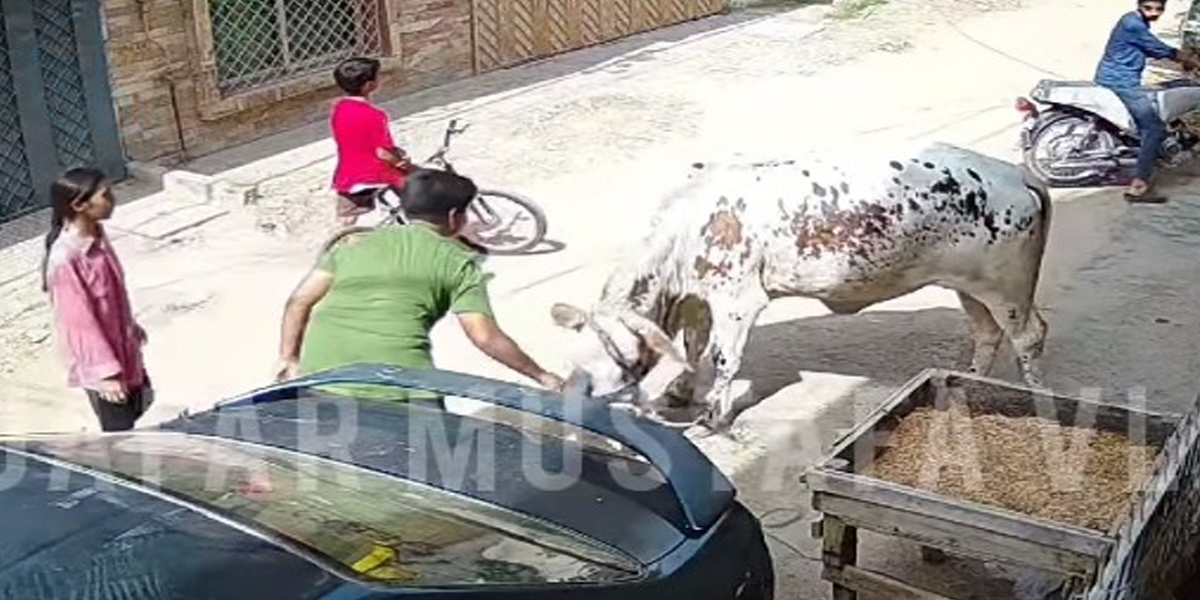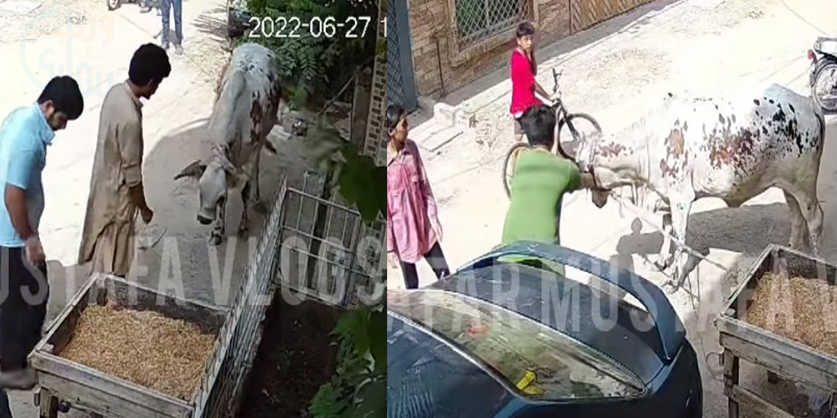 لیکن اس ویڈیو میں دیکھا جا سکتا ہے کہ دو بچے گائے کی جانب بڑھے اور ہاتھ لگانے کی کوشش کی، چونکہ گائے بھی شریف تو یہ بھی غنیمت تھی کہ جان بچ گئی، بچوں کے گائے کے مُہرے کو پکڑنے کی کوشش کی جو اچانک بچے کے ہاتھ میں آ گیا۔