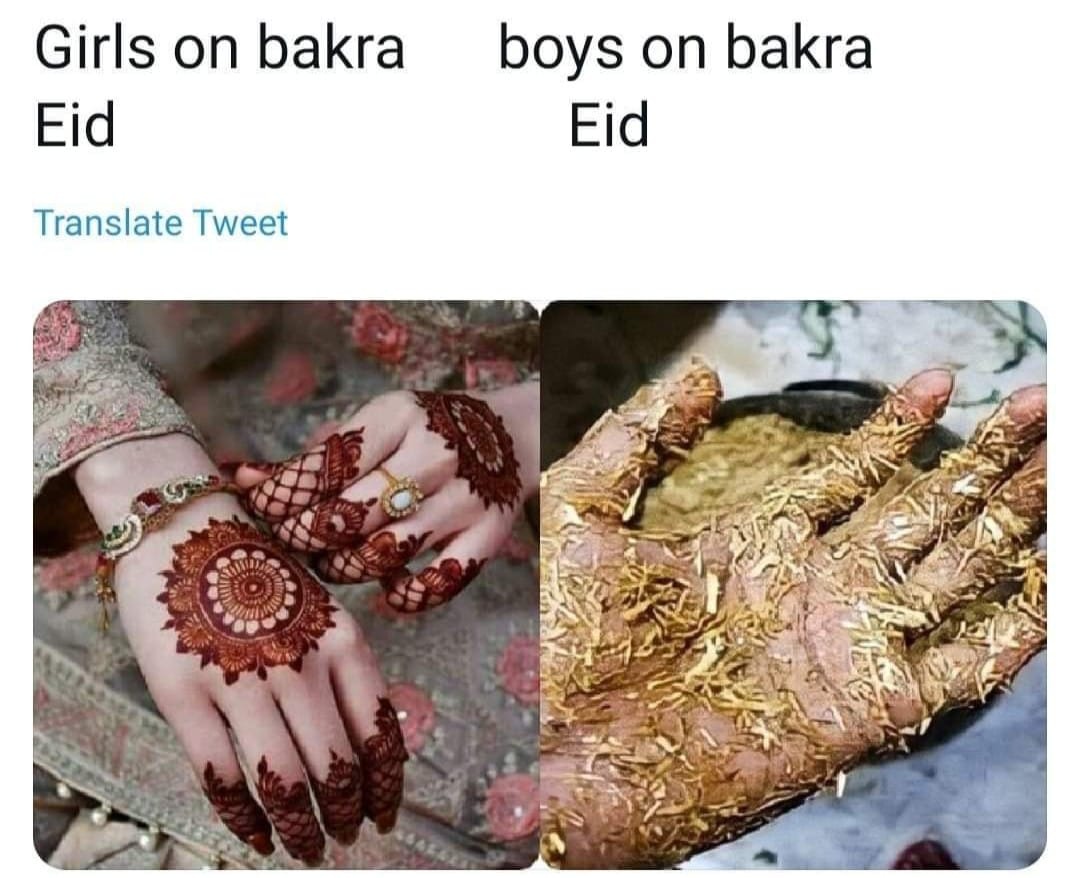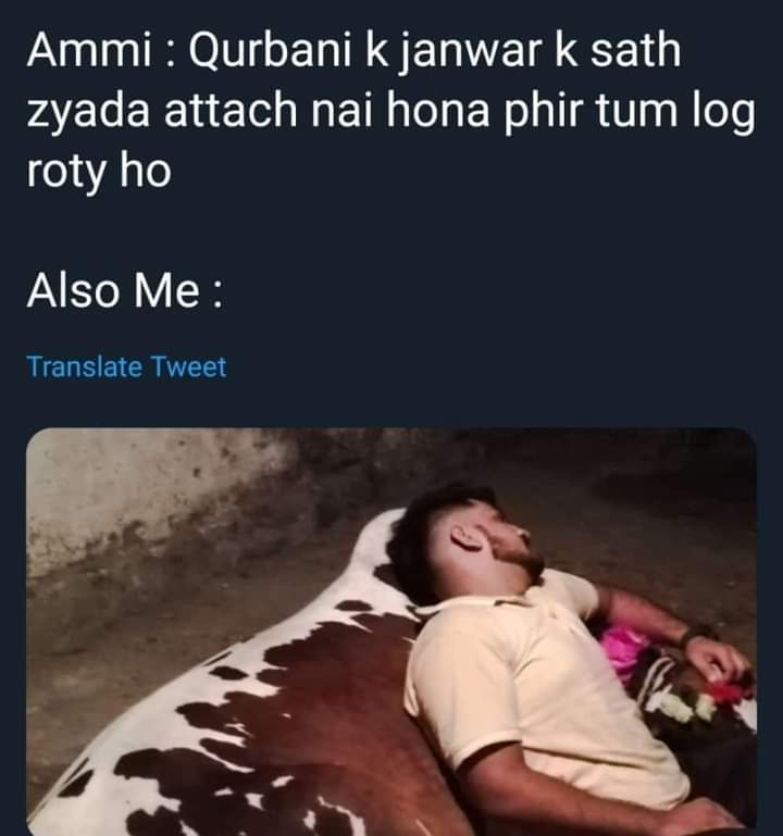 بڑی عید سے قبل قربانی کے جانوروں کی موجودگی سے گلی محلوں کی رونق میں اِضافہ ہوجاتا ہے۔ بچے بڑے سب ہی قربانی کے جانوروں کی خدمت درازی میں مشغول اور قربانی کے لیے برجوش دکھائی دیتے ہیں۔ سوشل میڈیا پر بھی گائے، بیل، بکروں کے حوالے سے مختلف پوسٹ شئیر ہو رہی ہیں جسے دیکھ کر صارفین بہت محظوظ ہورہے ہیں۔ فارغ اوقات میں اکثر قربانی کے جانوروں کی تصاویر اور ویڈیوز دیکھ لی جاتی ہیں۔ وہیں جانوروں پر بننے والی مزاحیہ میمز بھی خاص توجہ حاصل کرتی ہیں۔