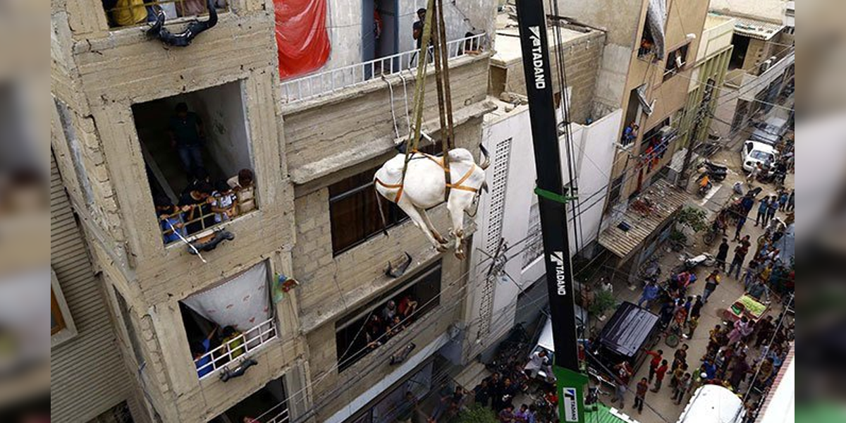 وہیں دوسری جانب ہر سال قربانی کے جانوروں کو چھت سے کرین کے ذریعے نیچے اتارنے کے مناظر دیکھنے کو ملتے ہیں جو کہ لوگوں کے لیے تو لطف و مزاح کا منظر ہوتا ہے مگر ایسا کرنا جانور کے لیے تکلیف اور خوف کا سبب بنتا ہے۔ بے زبان جانور کے دل میں خوف ہوتا ہے کہ انہیں اس طرح نیچے اتارا جا رہا ہے اور ایسا کرنے کے دوران کئی حادثات بھی پیش آچکے ہیں کیونکہ جب بیلوں کو نیچے اتارا جارہا ہوتا ہے تو اونچائی سے اور نیچے موجود لوگوں کے شور سے وہ گھبراتے ہیں مگر لوگوں کا اس بات کا کوئی احساس نہیں۔