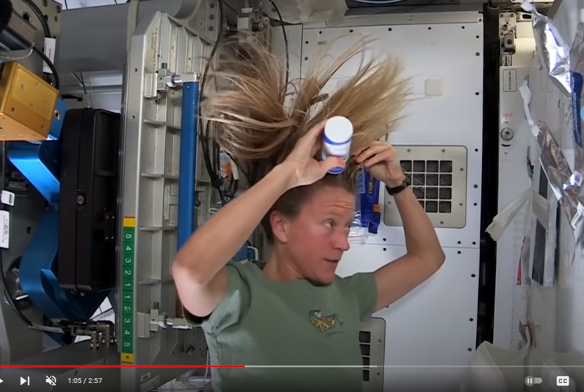 یہ کہتے ہی خاتون خلاء باز نے ایک پیکٹ نکالا جس میں گرم پانی موجود تھا، دوسرے ہی ہاتھ میں شیمپو کی باٹل تھی۔ پہلے تو خاتون نے بالوں کو کھولا اور پھر پیکٹ میں موجود گرم پانی کو سر میں لگانا شروع کیا، سب زیادہ مشکل پانی کو لگانے میں ہی ہوتی ہے، کیونکہ پانی بلبلوں کی صورت میں خلاء میں گھومتا رہا ہے۔