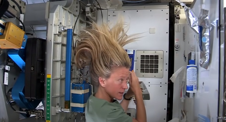 خاتون خلاء باز نے پانی جیسے تیسے کر کے بالوں میں لگایا اور پھر شیمپو کرنے لگی، اس کے بعد خاتون کنگے کو لے کر بکھرے ہوئے بالوں کو سمیٹنے لگی لیکن خلاء میں یہ مشکل کاموں میں سے ایک ہے۔