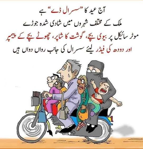 یقین نہ آئے تو عید کے دوسرے یا تیسرے روز سڑک پر کھڑے ہو کر دیکھ لیں۔ گاڑی تو گاڑی ہر دوسری موٹر سائیکل پر شوہر صاحب منہ بنائے، ایک بچے کو آگے بٹھائے موٹر سائیکل چلاتے ہوئے نظر آئیں گے۔ جبکہ ان کے پیچھے بیٹھی بیگم بھی ایک یا دو بچے ساتھ بٹھا فخریہ مسکراہٹ سجائے بیٹھی ہوں گی۔ موٹر سائیکل پر ہی بچوں کے پیمپر، دودھ کا ڈبہ اور گوشت کا بڑا سا تھیلا یہ بتانے کے لئے کافی ہوگا کہ سواری صاحب خانہ کے سسرال کی جانب رواں دواں ہے۔