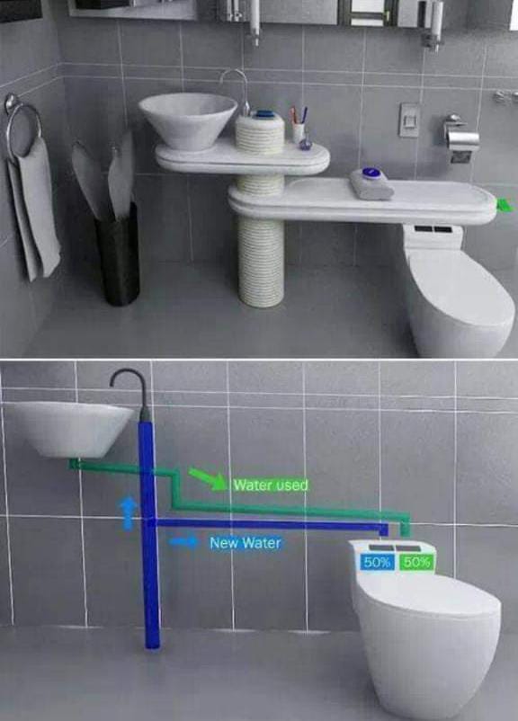 جیسے کہ اس تصویر میں آپ دیکھ سکتے ہیں کہ واش بیسن کے ساتھ فلش ٹینک کا کنکشن کیا گیا ہے۔ یعنی آپ منہ ہاتھ دھوئیں تو وہ پانی بھی ضائع نہیں ہوگا وہ پانی آپ کے کموڈ یا ڈبلیوسی کے فلش ٹینک میں جمع ہو جائے گا اور جب آپ باتھ روم استعمال کرنا چاہیں تو آپ کو علیحدہ سے فلش ٹینک بھرنے کی ضرورت نہیں پڑے گی، اور وہی پانی فلش کردیا جائے گا۔