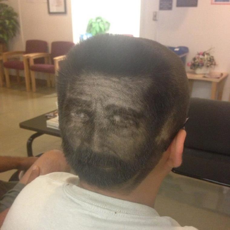 پہلی نظر میں اس تصویر کو دیکھنے میں لگتا ہے کہ کوئی آدمی ہمیں دیکھ رہا ہو۔ لیکن پھر سمجھ آتا ہے کہ یہ کسی آدمی کے پیچھے کے حصے والے بال ہیں جہاں اس نے انسانی شکل والا ہیر اسٹائل بنوایا ہے۔