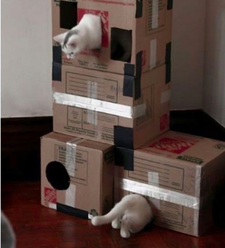 اس تصویر کو دیکھ کر ایسا لگ رہا ہے جیسے ایک بلی کا آدھا دھڑ نیچے ہے اور ایک کا اوپر لیکن درحقیقت ایسا نہیں ہے۔ یہ دو الگ الگ بلیاں ہیں جن میں سے ایک اوپر والے ڈبے میں ہے تو دوسری نیچے ڈبے میں داخل ہورہی ہے مگر دونوں کا جسم گتوں کے اندر کچھ اس انداز میں ہے جیسے لگ رہا ہو یہ ایک ہی بلی ہے۔