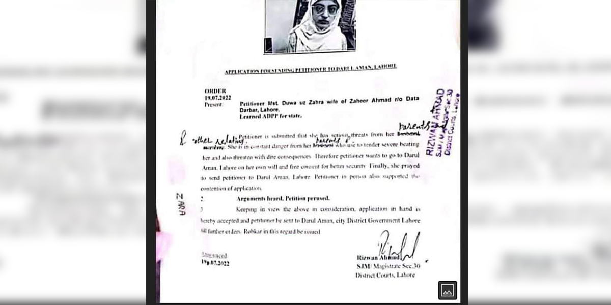 عدالت کے حکم پر دعا زہرا کو بعد ازاں دارالامان بھیج دیا گیا۔