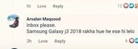 ارسلان مقصود نامی شخص نے مدد کا ہاتھ بڑھاتے ہوئے لکھا کہ انباکس کیجیے، میرے پاس سیمسنگ کا موبائل رکھا ہوا 2018 کا آپ کو میں ایسے ہی دے دوں گا۔