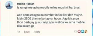 اوسامہ حسن نامی شخص نے لکھا کہ اس رینج میں اچھا موبائل خریدنا مشکل ہے۔ آپ اپنا آسان پیسہ انکباس کردیں مجھے میں 2500 بھیجنے کو تیار ہوں، آپ کی رینج میں اضافہ ہوجائے گا اور آپ اپنی والدہ کواچھا موبائل دلوا سکیں گے۔