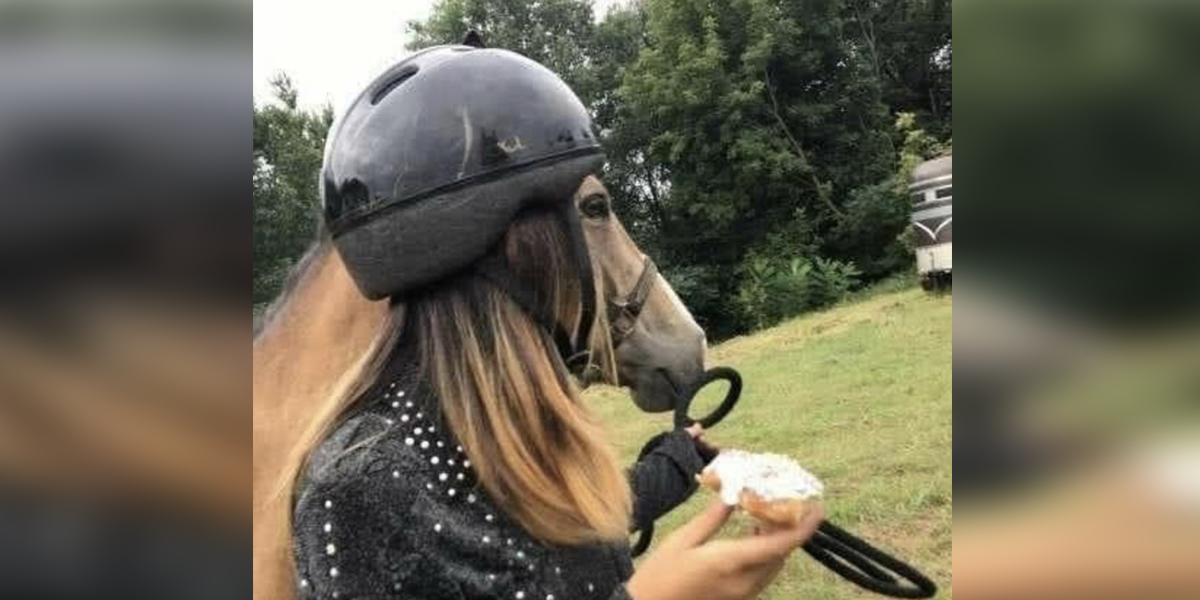 یہ کافی دلچسپ تصویر ہے۔ ایک گھوڑا جسے دیکھ کر لگ رہا ہے کہ اس کے سر پر ہیلمٹ موجود ہے مگر حقیقت میں نظر آرہا ہے ویسا بالکل نہیں۔ ہیلمٹ درحقیقت لڑکی نے پہنا ہوا ہے جس کے آگے ایک گھوڑے کا چہرہ بھی نظر آرہا ہے۔ لڑکی کا چہرہ نظر نہیں آرہا جس سے یوں محسوس ہوتا ہے کہ گھوڑے نے ہیلمٹ لگایا ہوا ہے۔